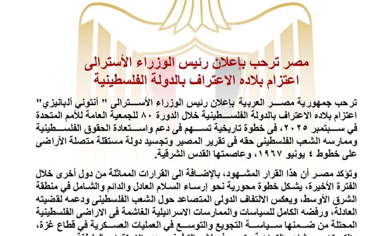 ترحب جمهورية مصر العربية بإعلان رئيس الوزراء الأسترالى ” أنتوني ألبانيزي” اعتزام بلاده الاعتراف بالدولة الفلسطينية خلال الدورة ٨٠ للجمعية العامة للأمم المتحدة في سبتمبر ٢٠٢٥، فى خطوة تاريخية تسهم فى دعم واستعادة الحقوق الفلسطينية وممارسه الشعب الفلسطينى حقه فى تقرير المصير وتجسيد دولة مستقلة متصلة الأراضى على خطوط ٤ يونيو ١٩٦٧، وعاصمتها القدس الشرقية.