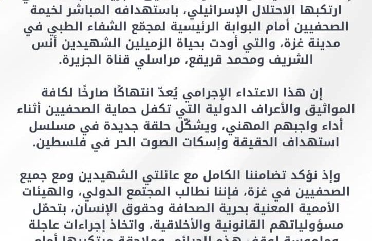 وجددت الشبكة تضامنها الكامل مع عائلتي الشهيدين وجميع الصحفيين في غزة، داعية المجتمع الدولي والهيئات الأممية المعنية بحرية الصحافة وحقوق الإنسان إلى تحمل مسؤولياتهم واتخاذ إجراءات عاجلة لوقف هذه الانتهاكات، وملاحقة مرتكبيها أمام المحاكم الدولية المختصة.