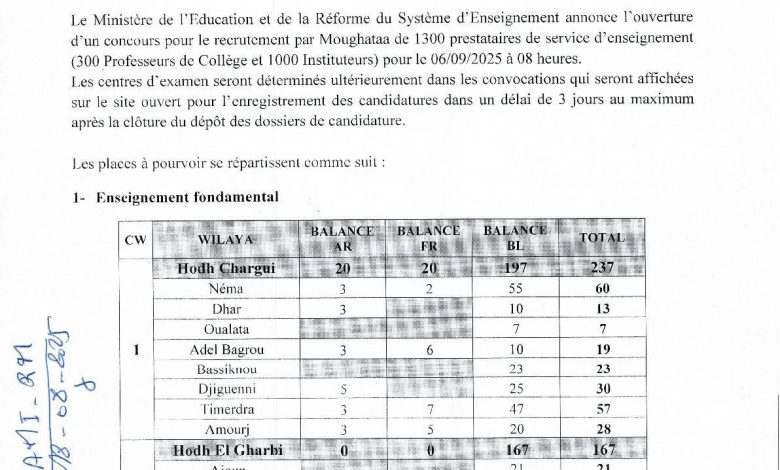 أعلنت وزارة التهذيب الوطني وإصلاح النظام التعليمي عن تنظيم مسابقة لاكتتاب 1300 مقدم خدمة تعليم، تشمل 1000 أستاذ تعليم أساسي و300 أستاذ تعليم إعدادي، وذلك يوم السبت 6 سبتمبر 2025 عند الساعة الثامنة صباحاً.