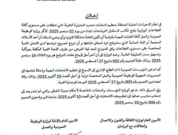 كما دعا البيان كافة النقابات والهيئات المهنية إلى الانخراط الإيجابي في العملية، والتقيد بالآجال المحددة، مشيراً إلى أن هذه الاستحقاقات تعد خطوة مهمة لترتيب الساحة النقابية وتعزيز دورها في خدمة العمال