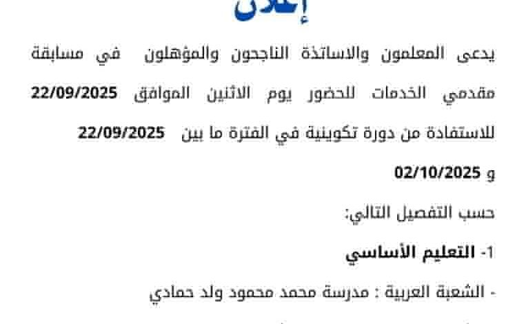 دعت وزارة التربية الوطنية وإصلاح النظام التعليمي، المعلمين والأساتذة الناجحين والمؤهلين في مسابقة مقدمي الخدمات، إلى الحضور يوم الإثنين 22 سبتمبر 2025، للمشاركة في دورة تكوينية تمتد حتى 2 أكتوبر المقبل.
