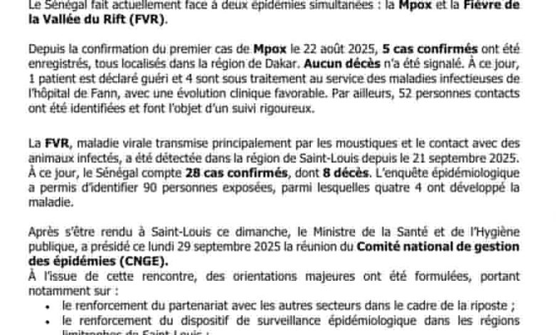 أعلنت وزارة الصحة السنغالية أن البلاد تشهد حالياً تفشي وباءين في وقت واحد، هما مرض جدري القردة (Mpox) وحمى الوادي المتصدع (FVR)، مما استدعى تفعيل لجنة وطنية لإدارة الأزمات الصحية.