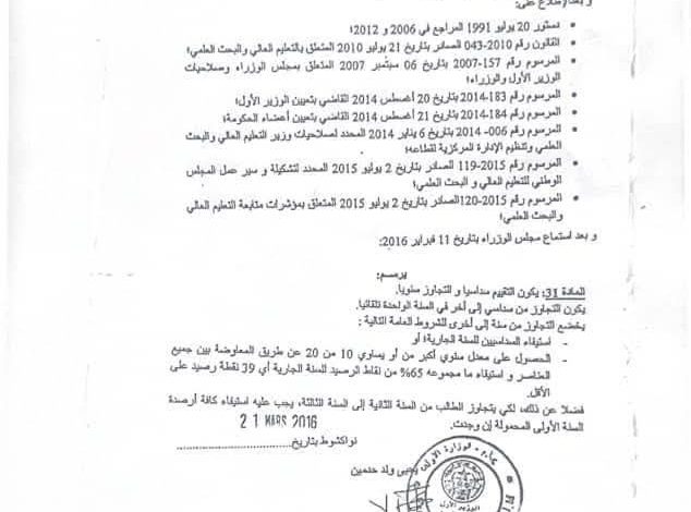 وأوضح البيان أن شروط النجاح والانتقال محددة في المادة 31 من المرسوم رقم 044/2016 الصادر بتاريخ 21 مارس 2016، والتي تشترط لاستيفاء السنة الدراسية أحد الأمرين: