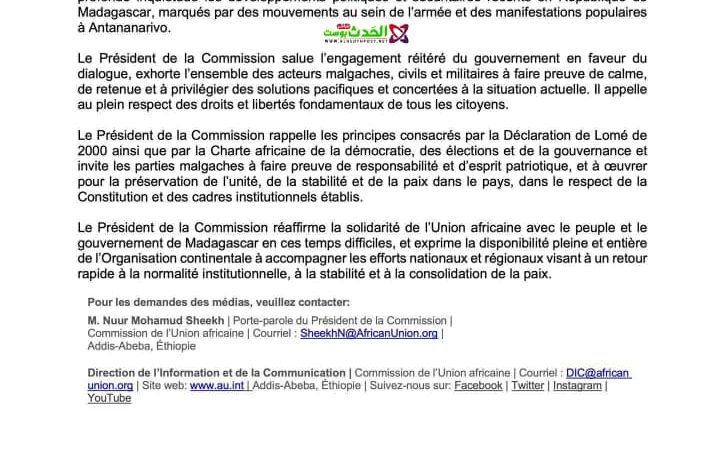 وأشار البيان إلى أن الاتحاد الإفريقي يتابع عن كثب تطورات الوضع في مدغشقر، مؤكداً التزامه بمرافقة هذا البلد الشقيق نحو استعادة الهدوء والاستقرار السياسي.