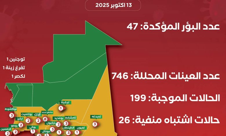 وقد سجلت المصالح البيطرية ، حتى اليوم13 اكتوبر 2025 ،ما مجموعه 47 بؤر ة موزعة على23 مقاطعة تتبع لعشر ولايات ,كما هو موضح في الصورة.