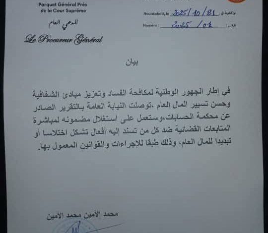 وأوضح البيان الصادر عن المدعي العام لدى المحكمة العليا، السيد محمد الأمين محمد الأمين، أن النيابة العامة ستستغل ما ورد في تقرير محكمة الحسابات من معلومات ومعطيات لفتح ومباشرة المتابعات القضائية ضد كل من تُسند إليه أفعال تشكل اختلاسًا أو تبديدًا للمال العام، وذلك طبقًا للإجراءات والقوانين المعمول بها في البلاد.