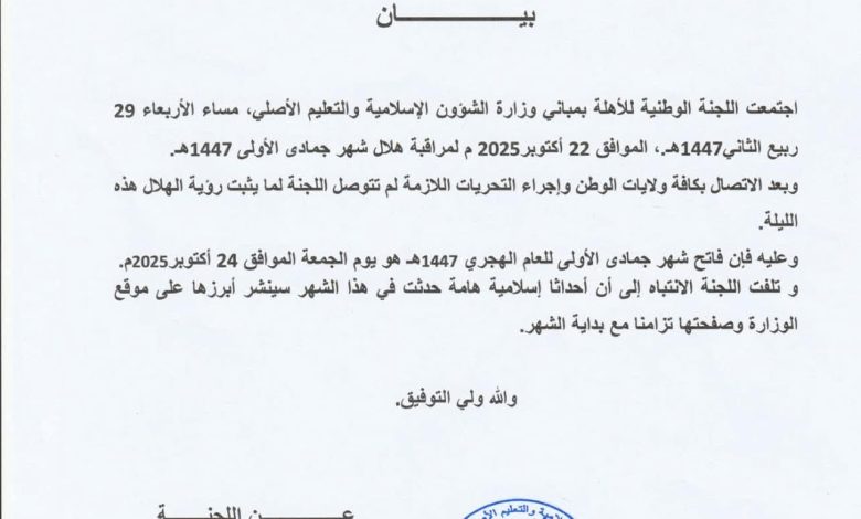 اللجنة الوطنية للأهلة: الجمعة أول أيام شهر جمادى الأولى 1447هـ
