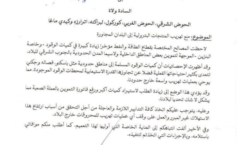عمّمت وزارة الداخلية وترقية اللامركزية والتنمية المحلية، تعميماً موجهاً إلى ولاة ولايات الحوض الشرقي، الحوض الغربي، كوركول، لبراكنه، اترارزه وكيدي ماغه، دعت فيه إلى اتخاذ إجراءات عاجلة للحد من تهريب المنتجات البترولية إلى خارج البلاد.