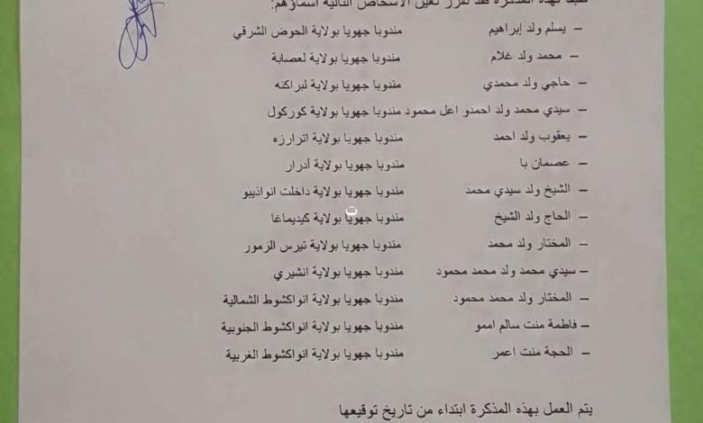 وبحسب المذكرة، فقد شملت التعيينات ولايات الحوضين، لعصابة، لبراكنة، كوركول، تكانت، آدرار، داخلت نواذيبو، كيدي ماغه، تيرس زمور، إضافة إلى ولايات نواكشوط الثلاث، حيث تم تعيين مندوبي سلطة النقل الطرقي بكل ولاية.