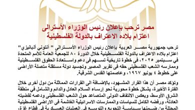 مصر ترحب بإعلان رئيس الوزراء الأسترالي اعتزام بلاده الاعتراف بالدولة الفلسطينية