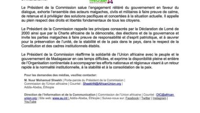 أعرب رئيس مفوضية الاتحاد الإفريقي، السيد محمود علي يوسف، عن قلقه العميق إزاء التطورات السياسية والأمنية الأخيرة في جمهورية مدغشقر،…