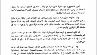أعربت الجمهورية الإسلامية الموريتانية عن رفضها القاطع والمطلق للإعلان الصادر عن سلطات الاحتلال الإسرائيلي بتاريخ 26 ديسمبر 2025، والمتعلق بالاعتراف…