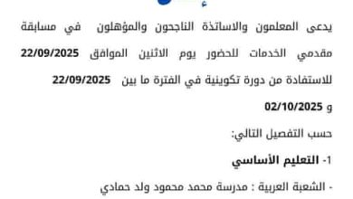 دعت وزارة التربية الوطنية وإصلاح النظام التعليمي، المعلمين والأساتذة الناجحين والمؤهلين في مسابقة مقدمي الخدمات، إلى الحضور يوم الإثنين 22…